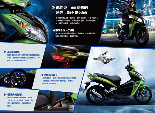 整R特点Q专利外观,外Ş大气朗Q充满动感时。国际著名专业设计公怸资深工程师智慧的l晶。机器h焊接的高强度大口径RӞ保行R安全舒适。组合前大灯、直照明系l,夜间行驶更安全。尾灯采用透明设计Q美观大方,亮度高,有效提高行驶安全性。高弹垫加上防前滑设计Q乘坐舒适不变Ş。铝合金后搁脚,质感与力度感充分体现?/div>