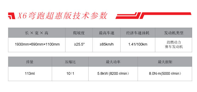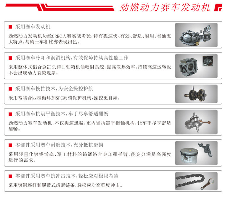 采用赛R发动机:(x)劲燃动力发动机历lCRRC大赛实战考验Q特有提速快、有劌Ӏ舒适、耐用、省油五大特炏V与骑士车相比亦表现?gu)?br />