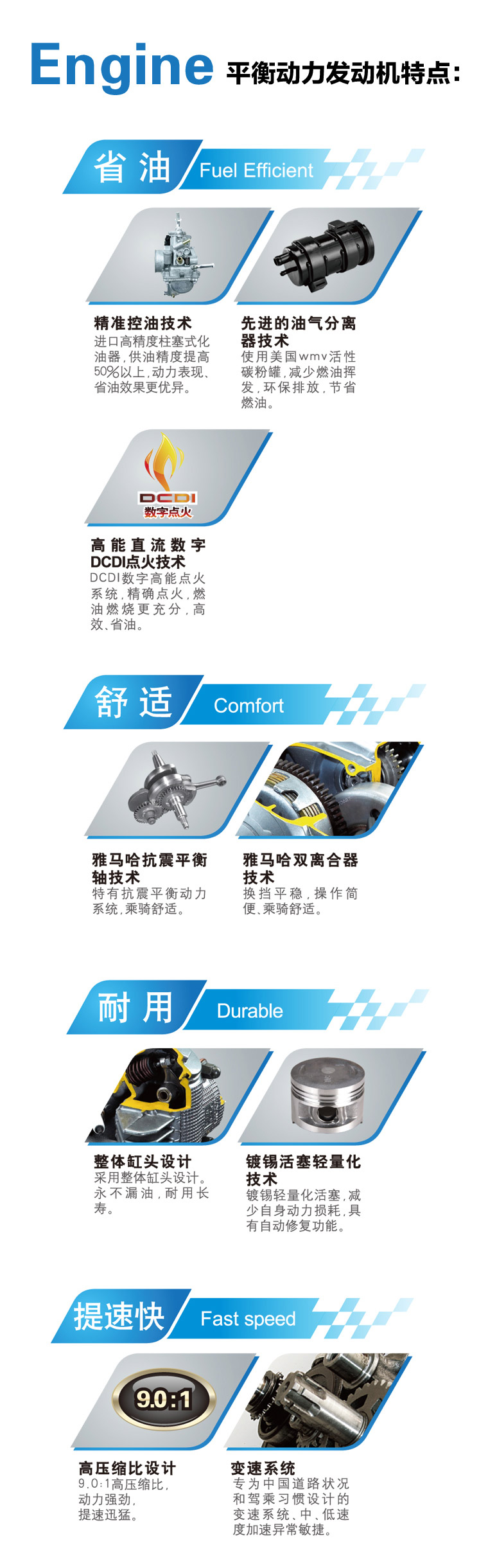 YB110q动力发动机特点:(x)舒?--雅马哈抗震^衡u技术,Ҏ(gu)抗震q动力pȝQ乘骑舒适。雅马哈双离合技术,换挡q稳无冲击,操作ѝ乘骑舒适?br />