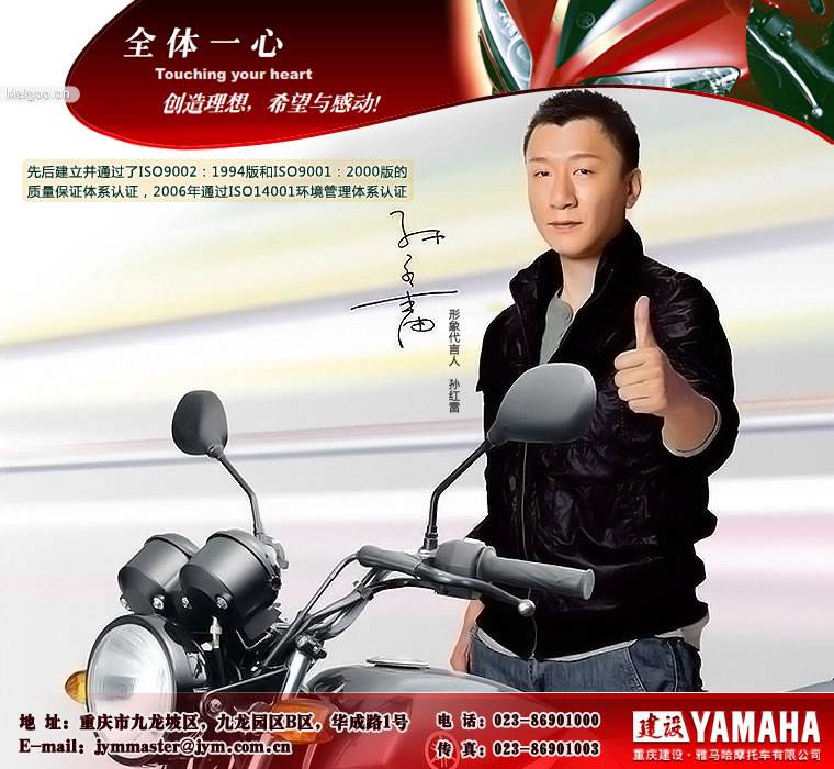 重慶建設(shè).雅馬哈摩托車(chē)有限公司是由建設(shè)工業(yè)有限責(zé)任公司與日本雅馬哈發(fā)動(dòng)機(jī)株式會(huì)社共同出資創(chuàng)辦的大型摩托車(chē)企業(yè),一九九四年正式投產(chǎn)。公司總投資額8100萬(wàn)美元,注冊(cè)資本6500萬(wàn)美元。公司主要車(chē)型有:“天劍”YBR125、“天劍王” YBR250、“天戟”YB125E、“勁悍”YBR125SP、“勁龍”JYM250太子車(chē)、“勁飚”JYM200城市路車(chē)、“勁豹”JYM150-A/B、“勁虎”JYM150輻條輪/壓鑄輪摩托車(chē)、TT-R50兒童越野車(chē)、“勁龍”JYM250J、JYM150J公安車(chē)、公務(wù)車(chē)等。