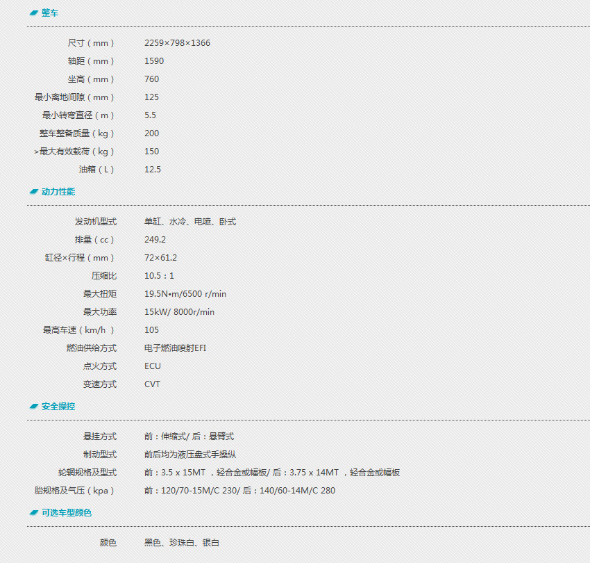 比國內(nèi)外同排量250CC車型功率更大,功率達(dá)到16.5KW,最高車速達(dá)到130KW/H。輕量化高強(qiáng)度曲軸設(shè)計, CVT發(fā)動機(jī)濕式離合器潤滑專利技術(shù),國內(nèi)首創(chuàng)CVT濕式離合器、SOHC四氣門一體式氣缸頭、噴淋式活塞潤滑技術(shù)應(yīng)用,并匹配國際領(lǐng)先的ducati閉環(huán)式免維護(hù)ECU電噴系統(tǒng)。