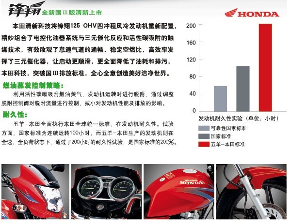 鋒翔125全新國三版清新上市,本田清新科技將鋒翔125 OHV四沖程風(fēng)冷發(fā)動機(jī)重新配置,精妙組合了電控化油器系統(tǒng)與三元催化反應(yīng)和活性炭吸附的觸媒技術(shù),有效改觀了怠速氣道的通暢,穩(wěn)定空燃比,高效率發(fā)揮了三元催化器。讓啟動更順滑,更全面降低了油耗和排污,本田科技,突破國三排放標(biāo)準(zhǔn),全心全意創(chuàng)造美好潔凈世界。(市場價格一般在6200-6600左右,裸車價,超過5000元以上的摩托車,享受最高定額650元的下鄉(xiāng)補(bǔ)貼)