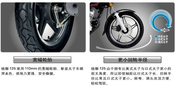 統(tǒng)御125由于擁有比美式太子與日式太子更小的前叉角度,所以即使軸距比日式太子長(zhǎng),回轉(zhuǎn)半徑比常見日式太子更小。轉(zhuǎn)彎、調(diào)頭靈活方便,輕松駕馭。采用無需維護(hù)保養(yǎng)的濕式濾芯,設(shè)計(jì)壽命為16000公里,比干式濾芯壽命提高了1/4,此外無需任何清潔工作。沒有了繁瑣的保養(yǎng)維護(hù),而濾芯的使命壽命卻更加長(zhǎng),省心、省力、省錢。統(tǒng)御125針對(duì)天氣寒冷的北方地區(qū)特別配置的化油器加熱裝置,可以低溫環(huán)境下自動(dòng)對(duì)燃油進(jìn)行預(yù)熱,改善燃油霧化效果,冬天啟動(dòng)更容易。采用轉(zhuǎn)速電子感應(yīng)裝置,提高轉(zhuǎn)速信號(hào)采集的可靠性與精度,耐久性更好,省去更換轉(zhuǎn)速線的麻煩。