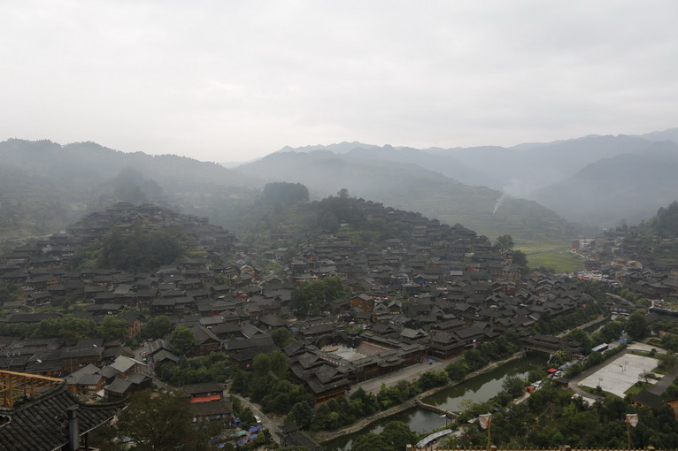 在離開神奇的西江千戶苗寨前,隊員陳晨決定前往觀景臺,一睹苗寨日出,可惜天空灰蒙蒙的一片,沒能看到朝霞美景。天氣預(yù)告今天貴陽會有大雨,也為今天的行程蒙上陰影。