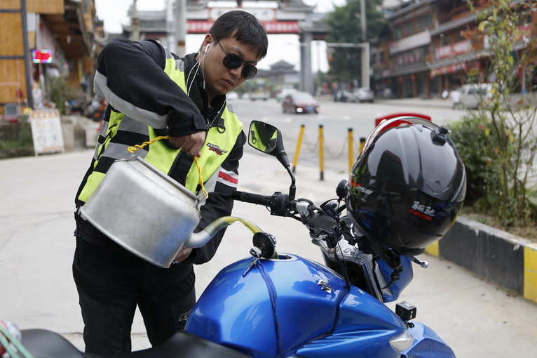 進入貴州,特色的油壺加油讓隊員們叫苦連天,一輛GW250加滿油箱,得加三壺油,往返加油機和摩托車之間三次,車隊五輛GW250加滿,就費了好大的功夫。