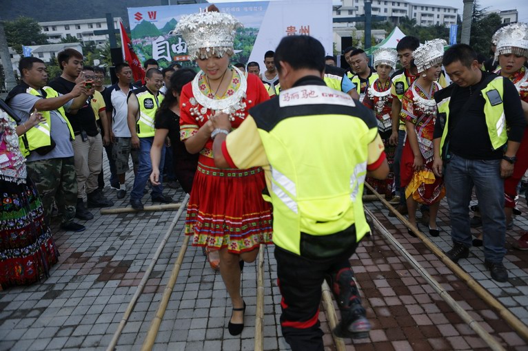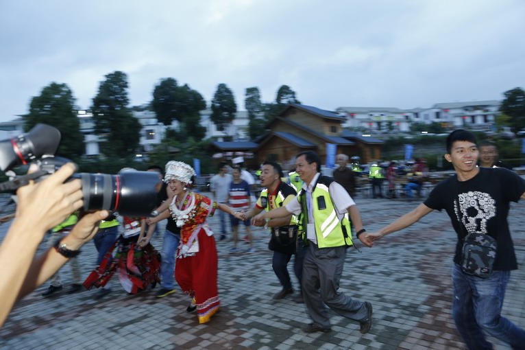 晚會環(huán)節(jié)開始,苗族美女登場,首先是民族特色舞蹈,舞蹈演員到臺下來和車迷們跳起竹竿舞。