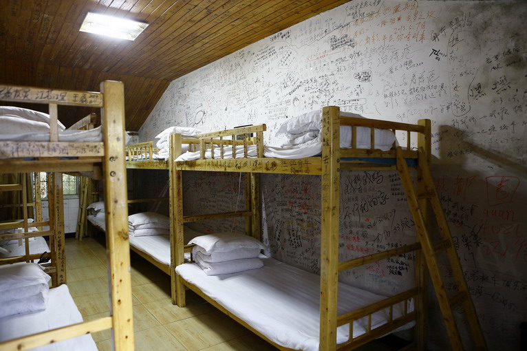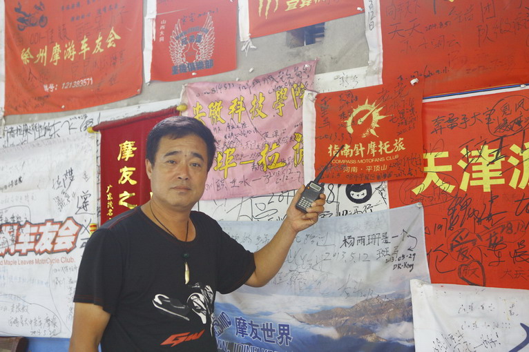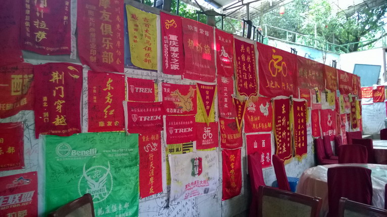 今晚落宿雅安,川藏線上的必經(jīng)之地。我們探訪了一家叫“東升竹莊”的青年旅館,這里是摩托迷、單車族、背包客的勝地。每個房間里,都寫滿了各種旅途的感受,而且,它還專門有一間大廳,掛滿了全國各地車迷俱樂部的隊旗,我們的沙漠行舟就找到了自己的隊伍。