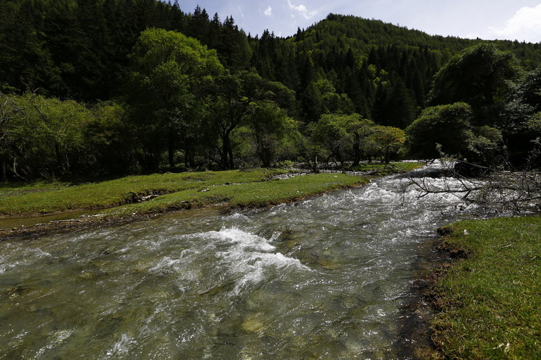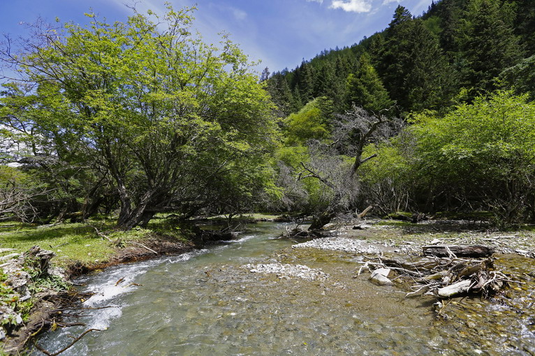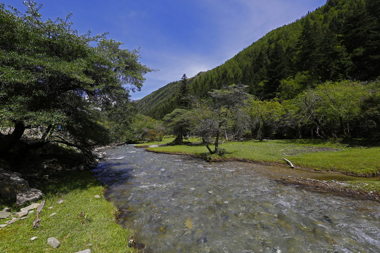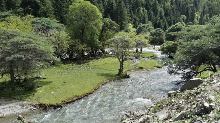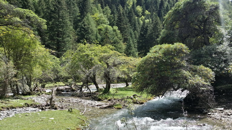 離開小金后,逃離山脊,盤旋到山谷之中,在夾金山附近,發(fā)現(xiàn)一片依傍小溪的優(yōu)美景色。