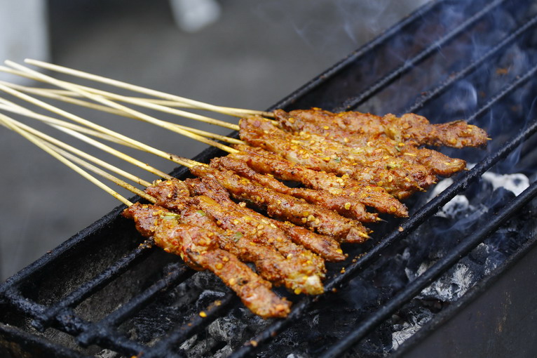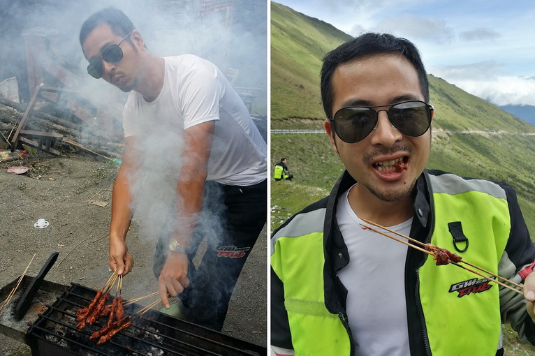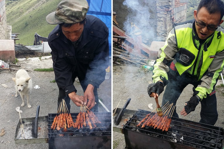 騎手們也到烤肉攤子一試身手,呼吸著海拔4000米的純凈空氣,咀嚼著天然無添加的高原羊肉,隊(duì)員們大快朵頤,補(bǔ)充體力。