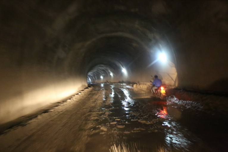 完全沒有照明,顛簸加積水的隧道。