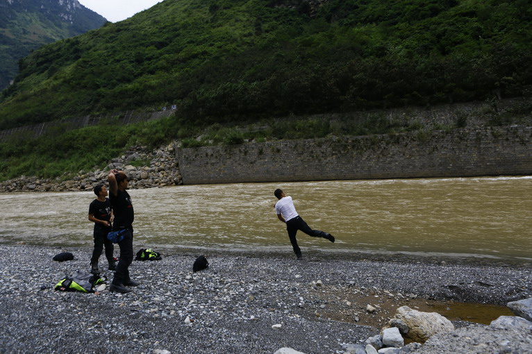 早上,自由之旅車隊(duì)來到了金沙江的一個(gè)石灘上,四位自由騎士看著數(shù)十米遠(yuǎn)的對(duì)岸和灘上的石塊,就開始比試起來,看誰能把石頭投擲到對(duì)岸。