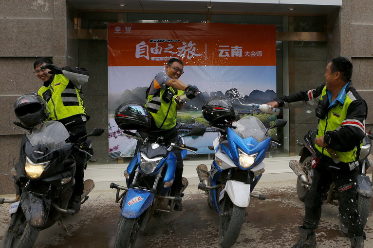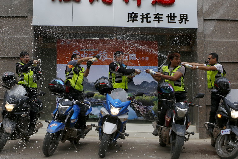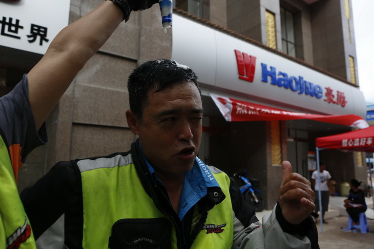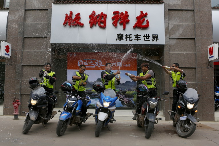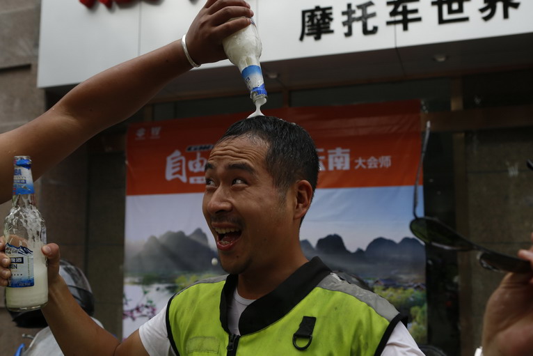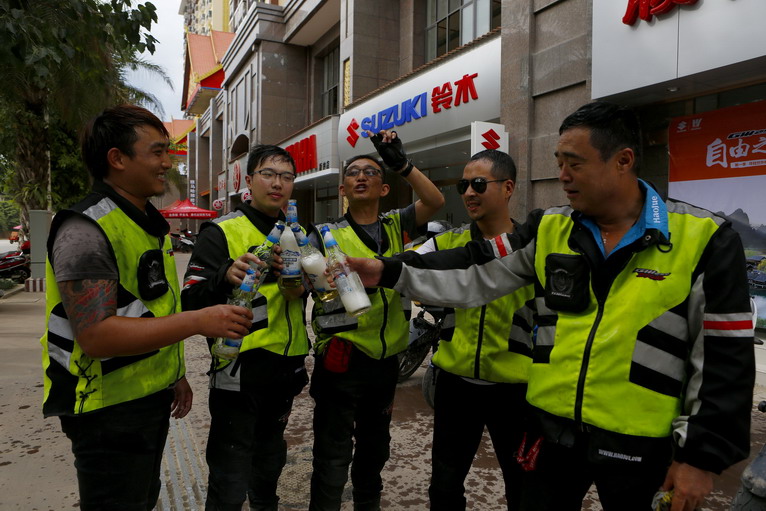 在版納的豪爵店前,隊(duì)員們以冰凍的啤酒代替香檳,慶祝勝利到達(dá)終點(diǎn)!