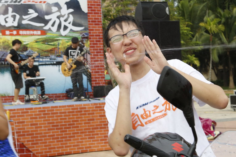 下午4時,景洪潑水廣場,身穿傣族服裝的美女在等候車迷到來,為到場車迷送上特色的潑水禮。