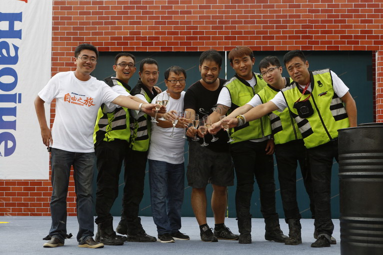 一直在幕后給大家默默服務的自由之旅車隊的官方代表,田領隊、高領隊上臺,與眾隊員一起打開香檳,慶祝勝利完成第一季。
