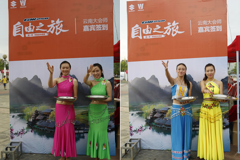 核心提示:9月21日,DAY37:GW250自由之旅第一季尋找世外桃源云南大會師。下午4時,景洪潑水廣場,身穿傣族服裝的美女在等候車迷到來,為到