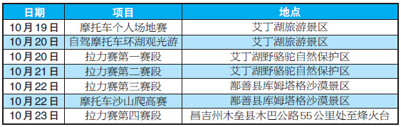 賽事設(shè)有環(huán)艾丁湖摩托車拉力賽、摩托車場地賽(分越野和踏板摩托車)、越野摩托車沙山爬高賽,以及自駕摩托車環(huán)湖觀光游四個項目。
