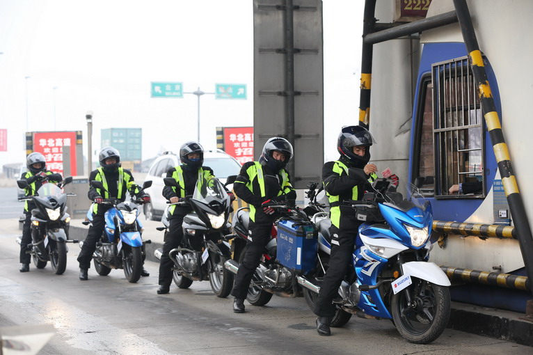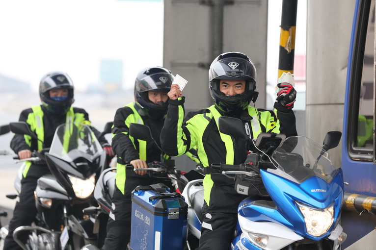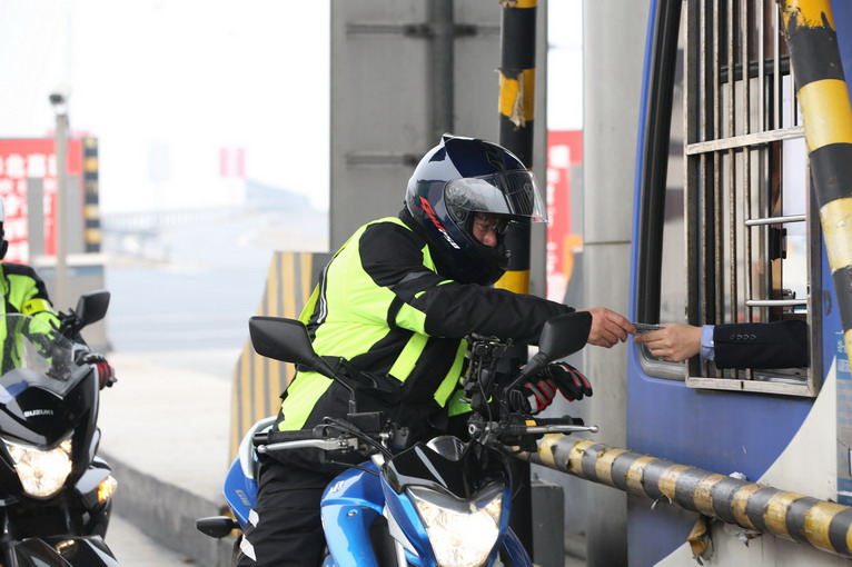 從匝道進(jìn)入高速入口。跟在汽車后方有序排隊(duì)、領(lǐng)卡。對(duì)著自由之旅車隊(duì),看慣摩托車上高速的收費(fèi)站人員,并不感到奇怪。