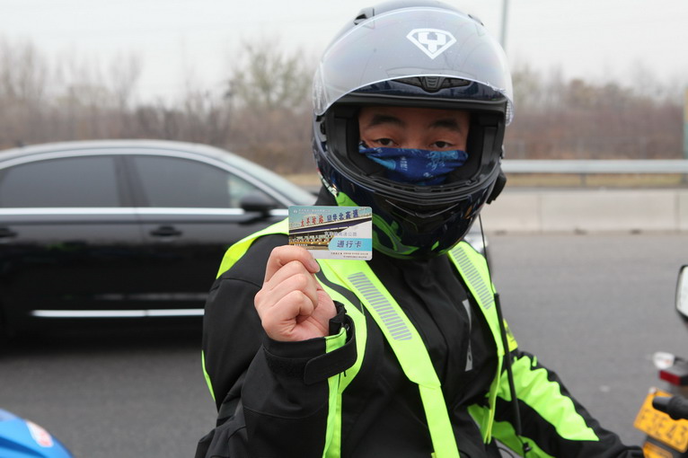 隊(duì)員們展示高速收費(fèi)卡。本次行走的首都高速全部按小轎車標(biāo)準(zhǔn)繳費(fèi)。