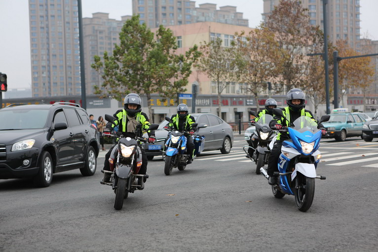 中午,車隊(duì)穿越連云港市區(qū)。圖片中馬路右側(cè)就是連云港的BRT快速公交專用道,摩托車可千萬不要開進(jìn)去哦,妨礙BRT不僅僅妨礙交通,而且也是大大的違章。