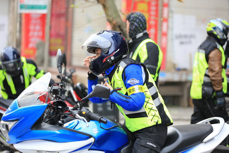 大家期待的女騎手小——李夢潔,今天正式上車,小編搞不懂的是,為什么女車都喜歡在出發(fā)前照鏡子呢,頭盔一蓋上不就都看不見了么。