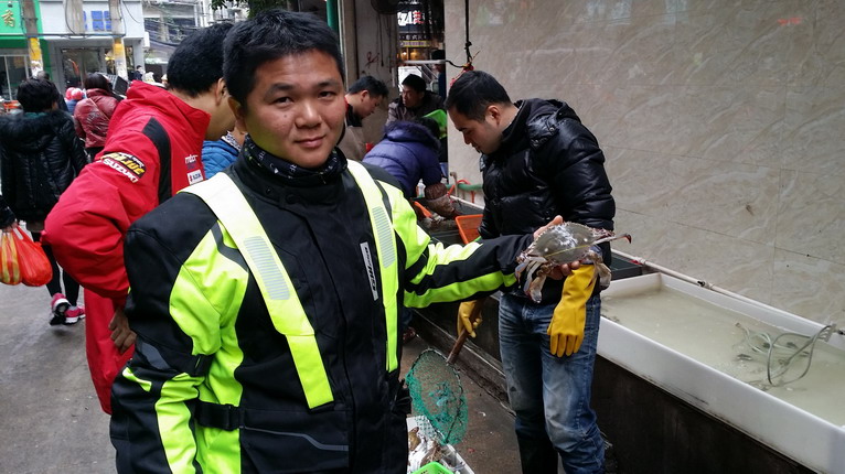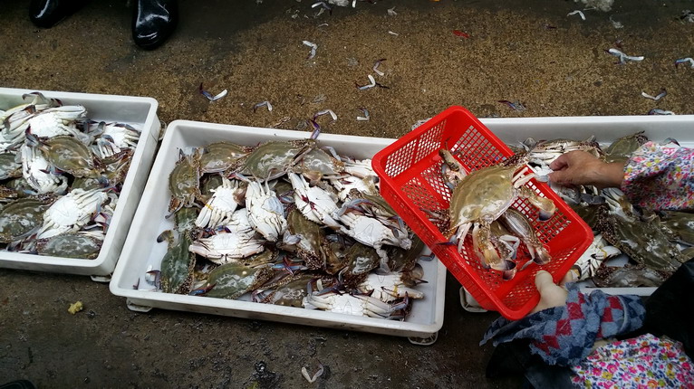 魚丸店外的海鮮攤,巴掌大的梭子蟹5元一斤,便宜的嚇人!廣東騎手莊健銘竟然想買上十斤快遞回家。