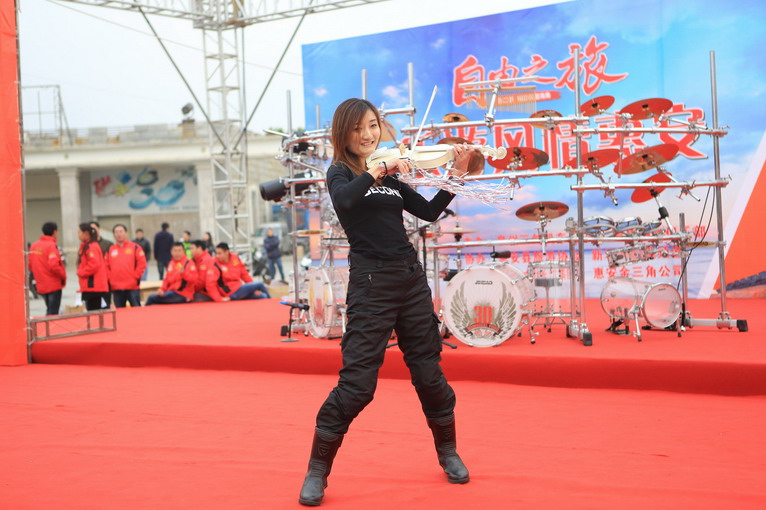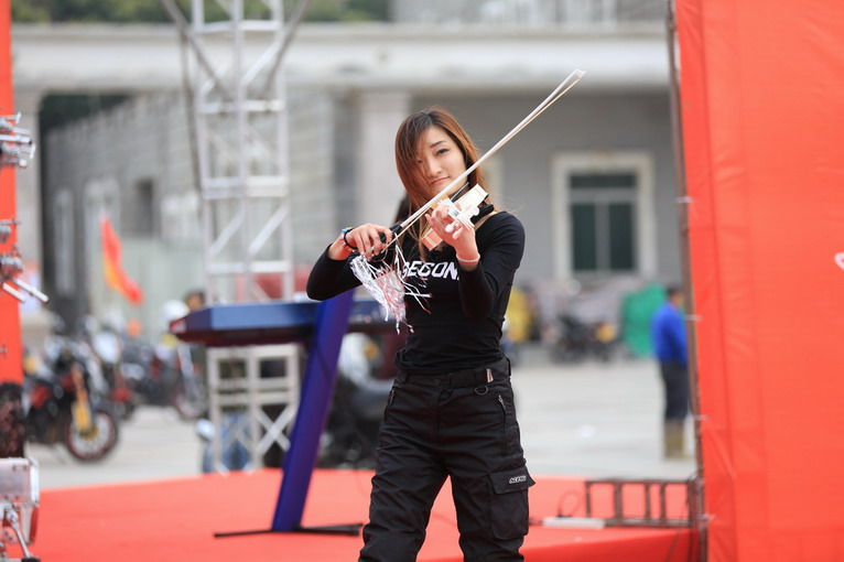 車(chē)友才藝表演上場(chǎng),先是自由之旅車(chē)隊(duì)的女騎手表演動(dòng)感電提琴。
