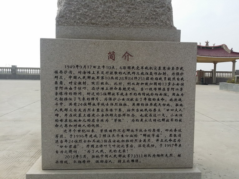 那是1949年9月,解放軍某部官兵,乘六艘機帆船,從平譚島來到崇武西沙灣,準備參加解放金門、廈門戰(zhàn)役。上午9點多,幾架國民黨軍隊的飛機,突然出現(xiàn)在崇武漁市上空。為了保護人民群眾,正在西沙灣練兵的解放軍官兵,毅然用機槍迎擊,把敵機引向自己。敵機隨即轉向攻擊解放軍,一陣陣狂轟濫炸。這時,一個哭喊著找媽媽的小女孩,從沙灘向農田奔跑,情況十分危急。五名解放軍戰(zhàn)士,不顧危險,從隱蔽的船體下、小樹林中沖出來,撲向小女孩,用血肉之軀擋住飛迸而來的彈片……小女孩得救了,而五名解放軍戰(zhàn)士卻獻出了年輕的生命。這一天,共有二十四名解放軍官兵在西沙灣畔為民捐軀。鎮(zhèn)里的老百姓紛紛涌向這里,流著熱淚為烈士整容,同時在附近沙地上挖出一個大坑,把烈士安葬。然后,按當?shù)仫L俗,在墳墓上搭起一個小房子,以供紀念。因此,民間稱呼烈士是"二十四大人"。