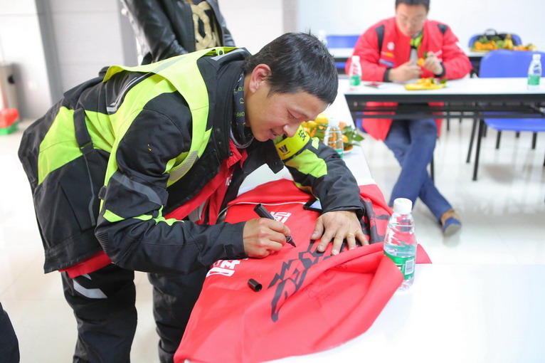 黑仔銘有雙重身份,既是GW250自由之旅的騎手,也是廣東GW車友會(huì)的群主,所以,交換隊(duì)旗的時(shí)候,他很糾結(jié),只能站在中間了!