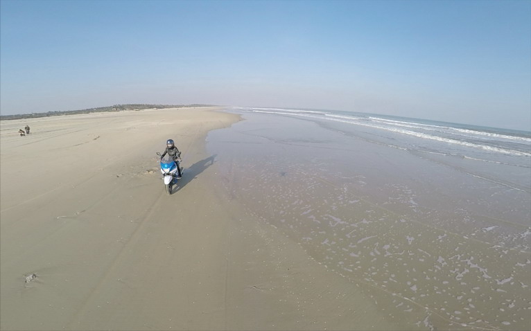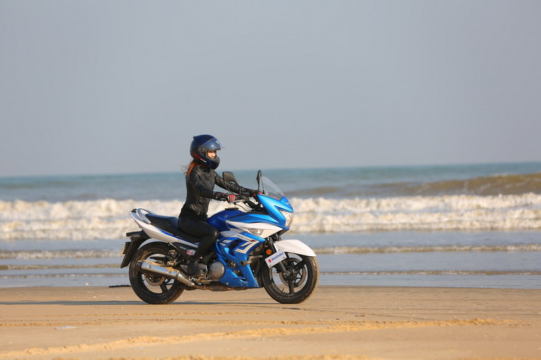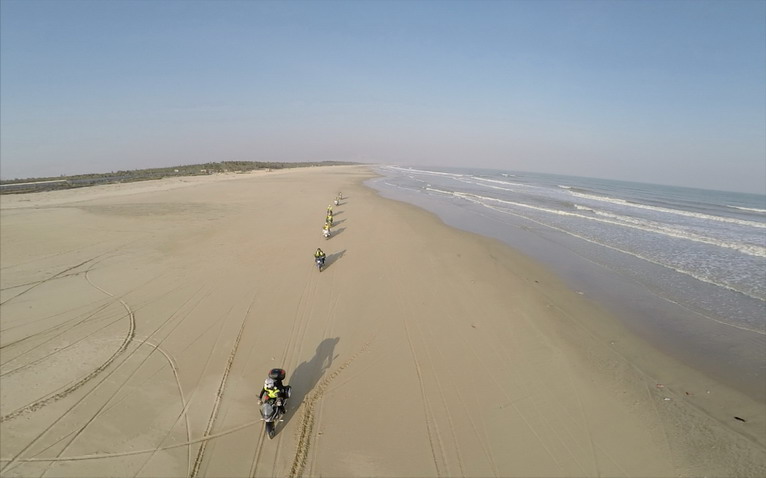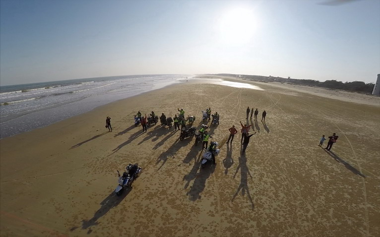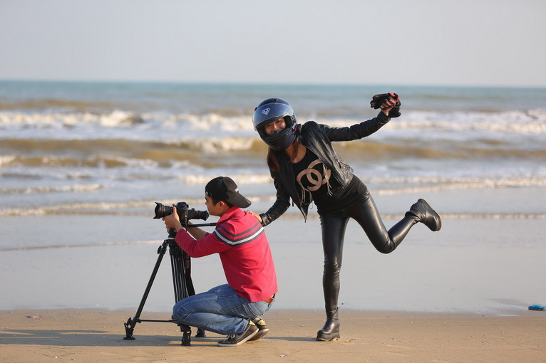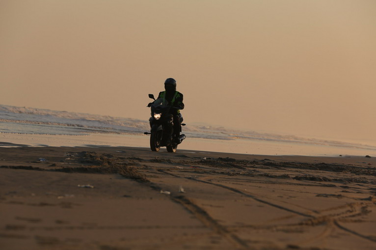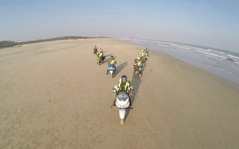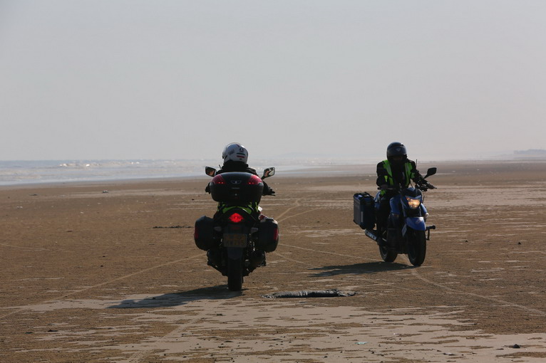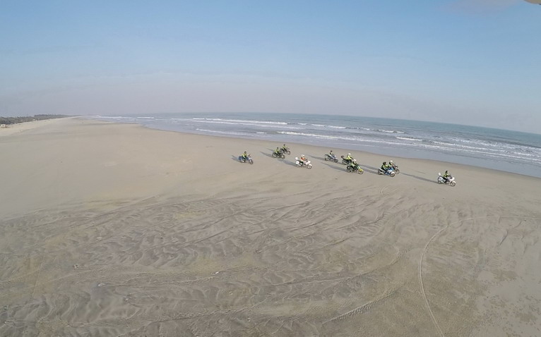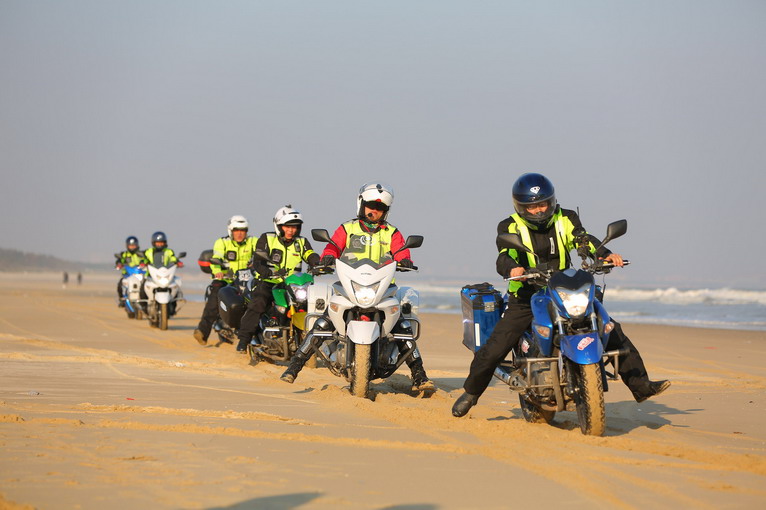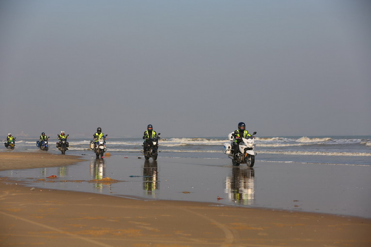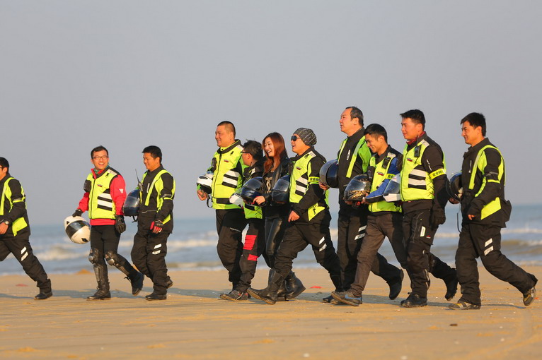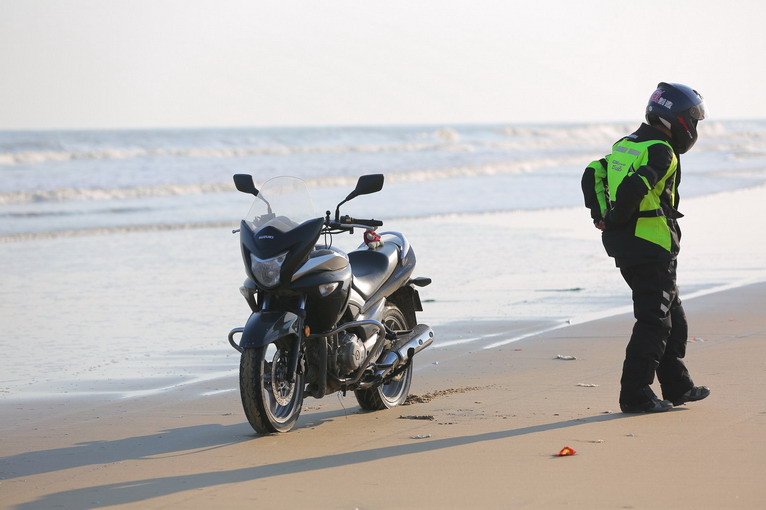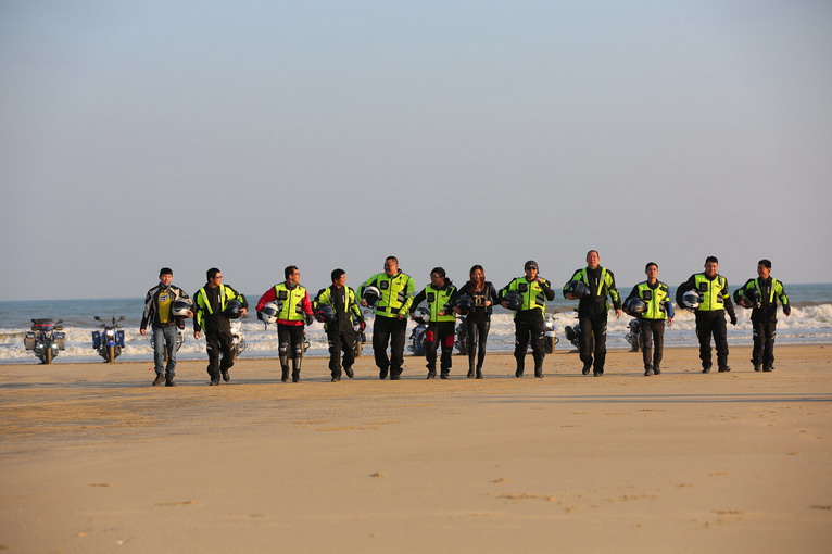 玩得興起,車隊(duì)成員在寬闊的沙灘上擺起了各種造型。沙灘騎行也不簡單,在一字型隊(duì)列里,車隊(duì)壓到前車的胎痕,集體失控,場面搞笑。