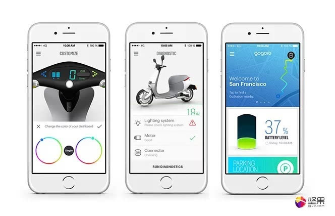 Gogoro SmartScooter 可以用手機(jī) app 進(jìn)行監(jiān)控,通過(guò)該應(yīng)用,可以設(shè)置個(gè)性化儀表盤、調(diào)節(jié)頭燈和尾燈功能,甚至選擇自己喜歡的摩托車啟動(dòng)聲音。還可以運(yùn)行診斷檢查、摩托車定位等。當(dāng)車主人不在身邊時(shí),如果車子被移動(dòng),手機(jī)應(yīng)用還會(huì)收到即時(shí)通知。