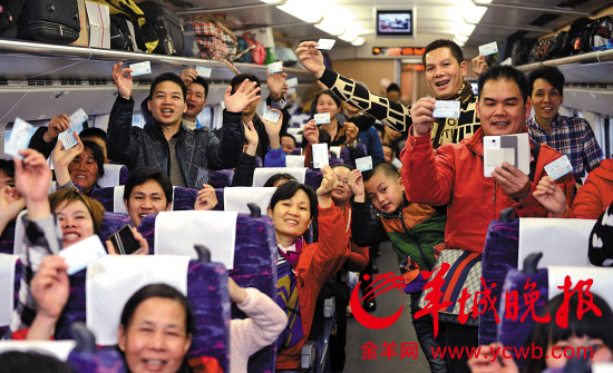 核心提示:首次春運(yùn)乘坐高鐵返鄉(xiāng)的鐵騎們歡呼雀躍 羊城晚報(bào)記者廣鐵春運(yùn)首趟外來工專列7日開出,南廣貴廣高鐵有望分流摩托大軍羊城晚報(bào)訊
