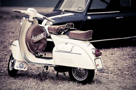 除了標(biāo)志性的Fred Perry Polo衫外,Ben Sherman的箭靶T恤、宅身西裝、Rayban墨鏡、Clarks沙漠靴或一雙Dr.Martens之外,一輛輕便的Vespa小綿羊機(jī)車也是趕時髦家伙們的指定裝備。通常的情況就是,這些年輕人在周一至周五勤快工作,一到周末就拿出衣柜中最漂亮的衣服去徹夜狂歡,而因為有了Vespa,他們也不用擔(dān)心趕不上最后一班公車之類的糗事。而且這款車的設(shè)計能夠保證他們亮麗的衣服和裝扮不會被飛濺的泥土弄臟。Mod族最喜歡的摩托車型號是Vespa的Scooter,喜歡改裝自己的摩托車,布滿車頭的大燈和反光鏡是它們的標(biāo)志。