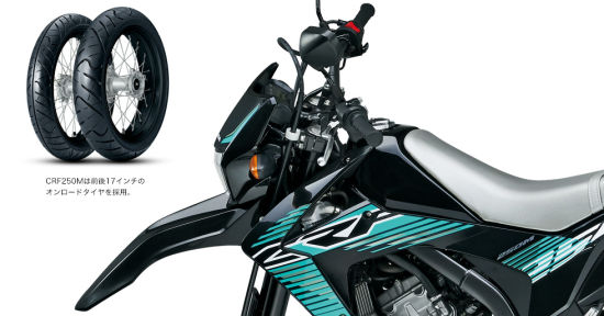 超級(jí)越野摩托車(chē)CRF250M是把CRF250L改裝上17寸的輪轂及街行輪胎,前制動(dòng)采用了更大直徑的浮動(dòng)式制動(dòng)盤(pán),同時(shí)改變了后減震的調(diào)校,以操控穩(wěn)定性為主要訴求。