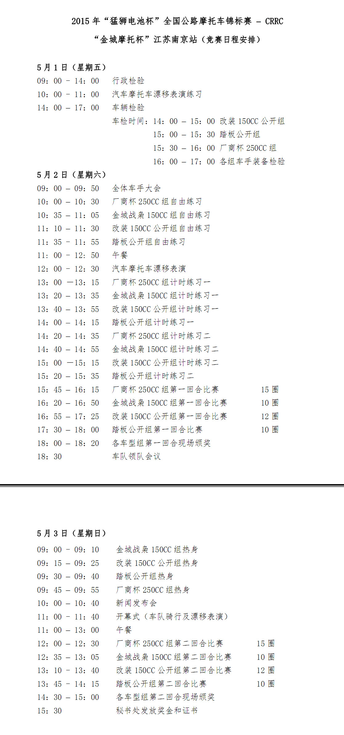 2015年“猛獅電池杯”全國公路摩托車錦標賽CRRC “金城摩托杯”江蘇南京站(競賽日程安排)