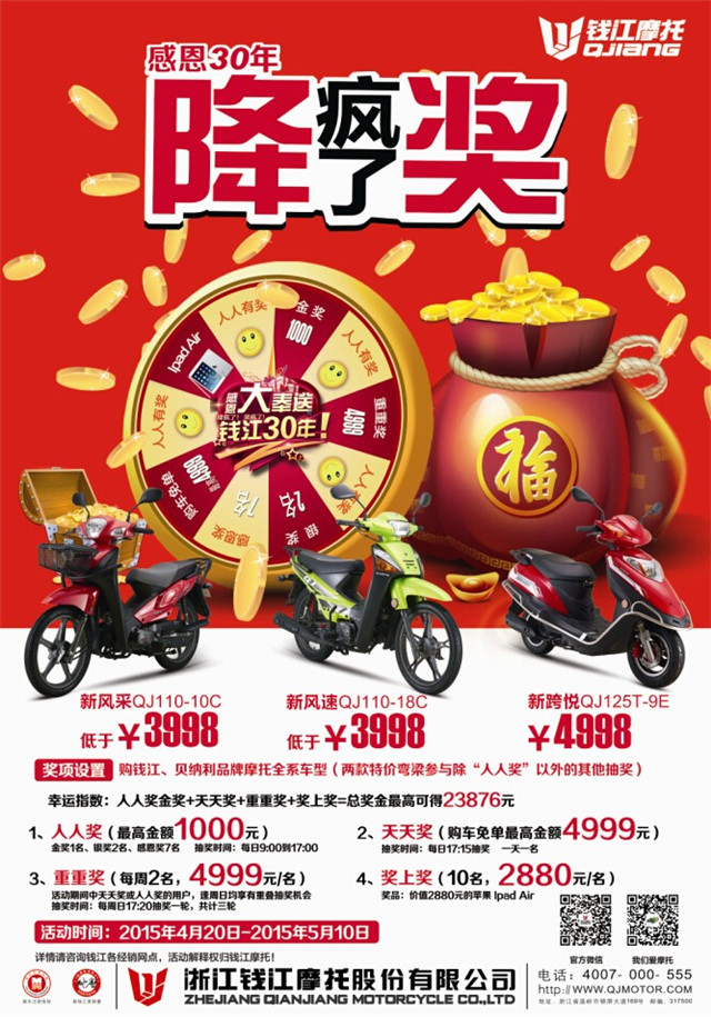 參與車(chē)型錢(qián)江品牌全系列車(chē)型、貝納利品牌全系列車(chē)型(新風(fēng)采QJ110-10C、新風(fēng)速Q(mào)J110-18C參與除“人人獎(jiǎng)”以外的其他抽獎(jiǎng));