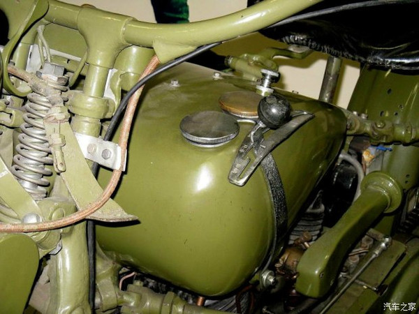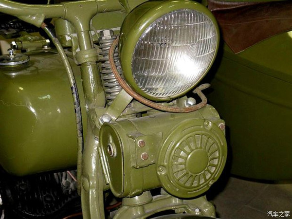 前照燈可安裝防空燈罩,提升自身安全。前照燈下是一只電喇叭,在必要的時(shí)候還可以作為防空警報(bào)發(fā)生器。在前照燈后的前車架安裝了起到緩沖作用的雙螺旋減震彈簧。