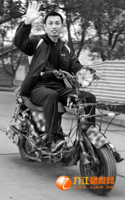 九江市急救中心司機(jī)小魏酷愛(ài)玩車,而且非常喜歡鉆研。經(jīng)過(guò)十多天的努力,他自制的一輛“迷你型摩托車”,終于可以上路了。