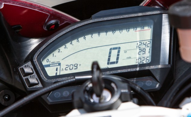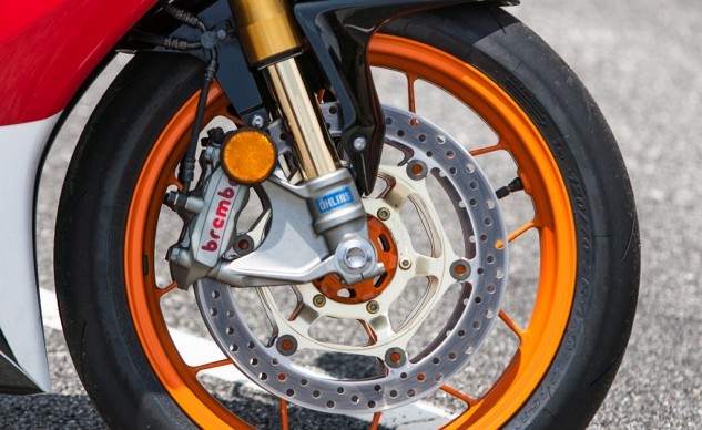 我們曾經(jīng)測試過非SP版的CBR1000車型,這臺四缸發(fā)動機在10,400rpm時能夠爆發(fā)出144.3馬力的最大功率,在7,500rpm時能夠達到101N·m的峰值扭矩。這輛CBR1000RR SP車型升級了活塞、進排氣等,因此動力性能相比標準版車型會有更好。盡管沒有流行的TC(牽引力控制)等裝備,但我對自己的能力還是很有信心的,憑借大腦和肢體已然能夠讓這臺SP車型開足馬力。