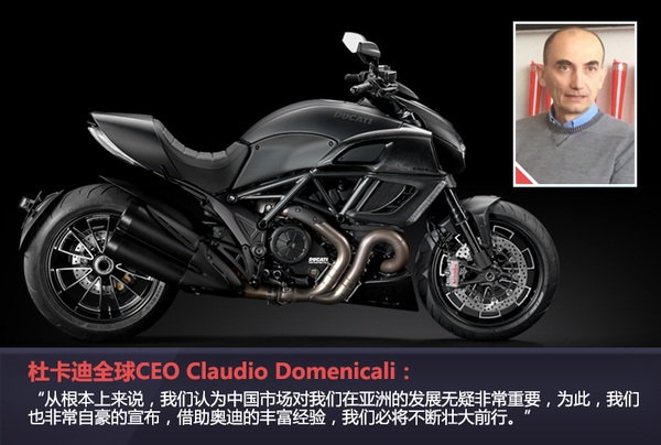 2015年我國汽車行業(yè)步入了低谷,各家車企的年銷目標(biāo)都面臨達(dá)不到的尷尬境遇,和汽車市場類似,受到汽車降價和部分城市禁摩的沖擊,2014年我國摩托車產(chǎn)銷量分別為2126.78萬輛和2129.44萬輛,同比也有所下降,不過摩托車市場潛力非常大。杜卡迪作為摩托車市場中的領(lǐng)導(dǎo)品牌,越來越注重中國市場的拓展和開發(fā),網(wǎng)通社在對杜卡迪全球CEO Claudio Domenicali先生對網(wǎng)通社表示,明年年中起,中國部分地區(qū)取得資質(zhì)的奧迪經(jīng)銷商可以銷售杜卡迪摩托車。此舉表明杜卡迪有意借奧迪完善的經(jīng)銷商體系來方面自己擴(kuò)大市場,在品牌建設(shè)方面發(fā)力。