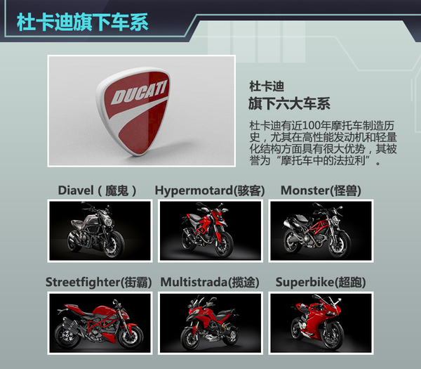 奧迪在汽車領(lǐng)域的直接競爭對手寶馬品牌也有摩托車制造的傳統(tǒng),在國際摩托車市場上享有極高的聲譽,奧迪將杜卡迪收入旗下,也是對自身業(yè)務(wù)的一次拓展,同寶馬品牌形成全方位的對抗。與此同時,杜卡迪品牌憑借其高端的形象與摩托車圈中的地位,對于奧迪品牌也有一定的提升作用,二者的聯(lián)姻可以說是互利共贏。