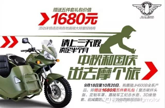 9月18日到10月20日購(gòu)買(mǎi)嘉陵600邊三輪,你將得到一套5件套大禮包: