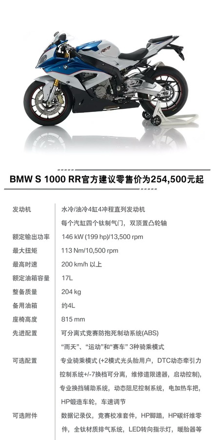 此次發(fā)布的BMW S 1000 RR共2款車型,官方建議零售價為運動版RMB 254500元;競技版RMB 273200元。