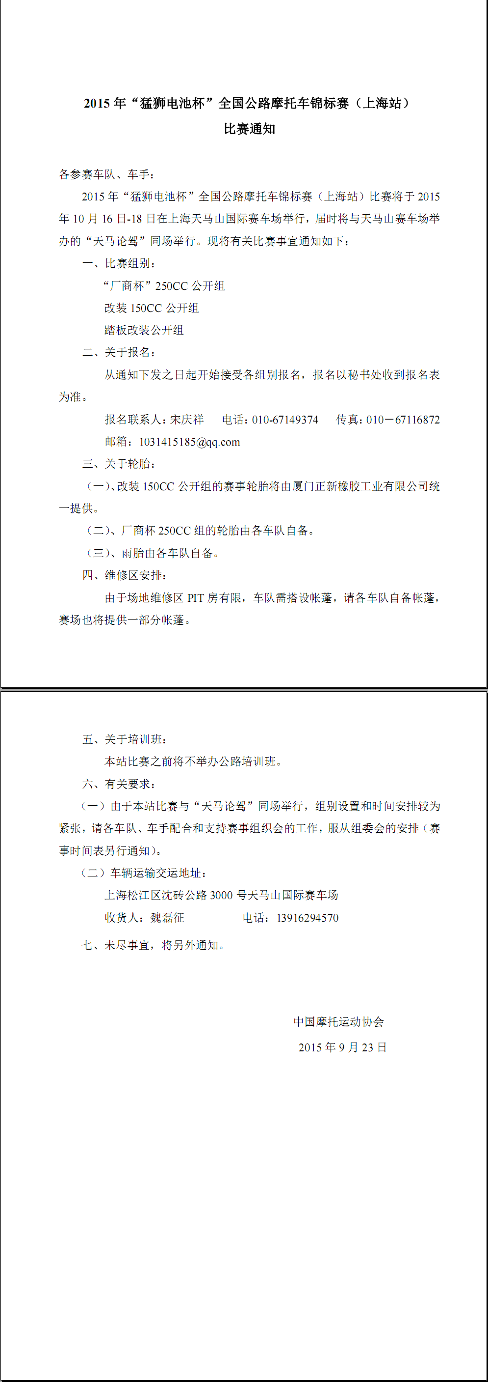 核心提示:下載:2015年猛獅電池杯全國公路摩托車錦標(biāo)賽(上海站)比賽通知