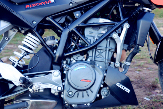 “小馬拉大車”的情況屢見不鮮尤其是在國產(chǎn)摩托車中,250cc發(fā)動機(jī)都能扛著公升級的車重滿街跑,但要說這200 DUKE和Z250SL那絕對是“大馬拉小車”,分別132公斤和151公斤的整備質(zhì)量,懷里揣著的可都是“野到不行不行的心”。它們都采用高性能、高轉(zhuǎn)速輸出的四氣門雙頂置凸輪軸水冷單缸發(fā)動機(jī),相差的只是那50cc的排氣量。200 DUKE 在10000轉(zhuǎn)可以達(dá)到19千瓦最大功率,8000轉(zhuǎn)爆發(fā)最大扭力19.5牛米;Z250SL 18.8千瓦最大功率和22.5牛米最大扭力都在8000轉(zhuǎn)輸出。兩車都擁有非常凌厲的加速體驗(yàn),Z250SL較為簡單、暴力,200 DUKE更顯輕靈些。表顯極速:200 DUKE為136公里/小時(10500轉(zhuǎn)出現(xiàn)引擎斷油保護(hù)),Z250SL為146公里/小時(無保護(hù)限制)。200 DUKE和Z250SL引擎震動都被處理得比較到位,但Z250SL脈動感更強(qiáng)。大培子想說的是200 DUKE的引擎保護(hù)功能不但影響到200 DUKE極速的發(fā)揮,還導(dǎo)致在加速時需要頻繁換擋(轉(zhuǎn)速剛過8000轉(zhuǎn)發(fā)力區(qū),對不起一萬轉(zhuǎn)斷油了......)。引擎溫度控制大培子個人感覺Z250SL處理得更好些,因?yàn)?00 DUKE水箱散熱風(fēng)扇啟動頻率過于頻繁。
