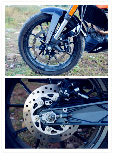 200 DUKE和Z250SL ABS制動效能方面的表現(xiàn)也可謂尺有所短寸有所長。200 DUKE不具備ABS制動防抱死功能是遺憾,而且200 DUKE后制動較為容易發(fā)生抱死現(xiàn)象,但是200 DUKE所采用BYBRE(BREMBO和博世印度合股公司產(chǎn)品)制動系統(tǒng)配置較Z250SL高,200 DUKE采用BYBRE輻射式對向四活塞卡鉗、300毫米前浪花制動盤在制動時會給你帶來“撞墻”的效果而且較為敏感。Z250SL ABS相比200 DUKE的優(yōu)勢在于配置了日清ABS防抱死,擁有更好的制動安全性和穩(wěn)定性,但是如果拋開ABS功能不說的話,200 DUKE制動效能略強(qiáng)于Z250SL,倒不是說Z250SL制動不好只是與200 DUKE相比顯得更平庸、更均衡。
