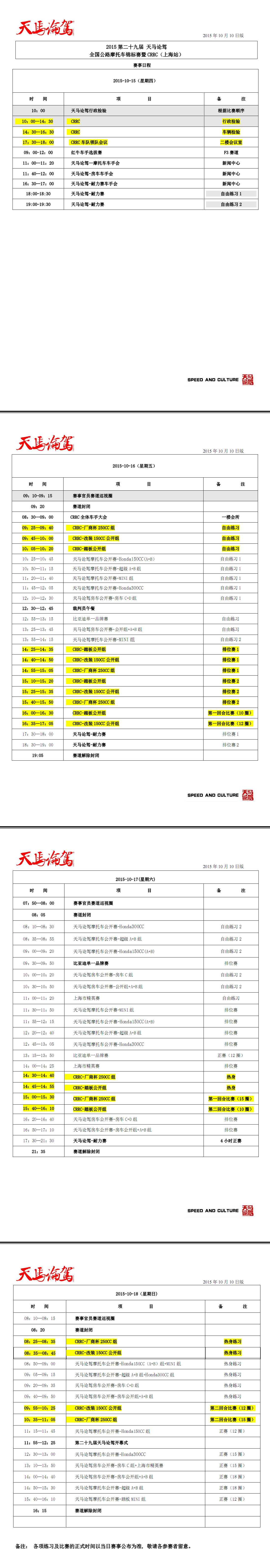 2015第二十九屆天馬論駕全國公路摩托車錦標賽暨CRRC上海站賽事日程