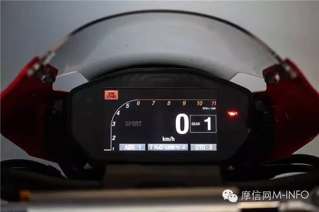 真彩TFT液晶屏幕會根據(jù)不同的駕駛模式有不同的顯示式樣(圖為顯示1擋的畫面)。在Monster 1200R上很多系統(tǒng)參數(shù)(發(fā)動機模式,牽引力控制,ABS等)都是可以通過菜單系統(tǒng)來調(diào)節(jié)并顯示在屏幕上,當然前提是你掌握了繁復的設(shè)置操作。