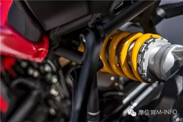 后減震 Öhlins 彈簧預(yù)載 壓縮和回彈阻尼可調(diào),行程16cm.