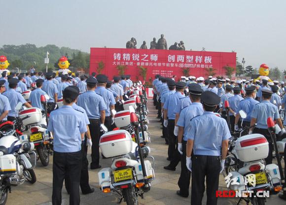 (由湘潭市人民政府主辦的大長江集團·豪爵摩托電噴節(jié)能警車EN150J捐贈儀式在東方紅廣場舉行,100輛電噴節(jié)能警車正式投放湘潭公安系統(tǒng)使用。)