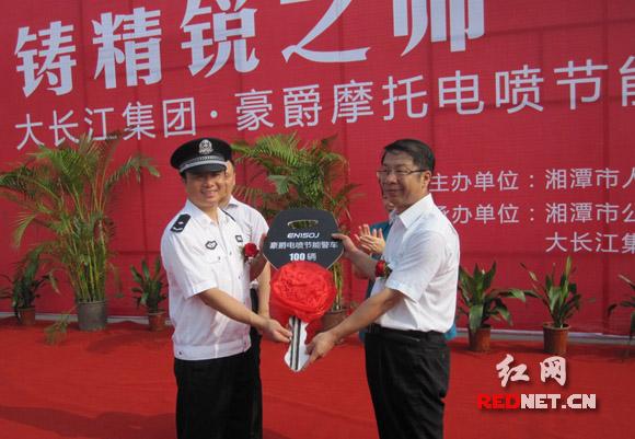 (湘潭市委副書記、市長史耀斌(右)代表湘潭市人民政府接受大長江集團捐贈警車的鑰匙,并將100輛捐贈警車向湘潭市公安局發(fā)放。)
